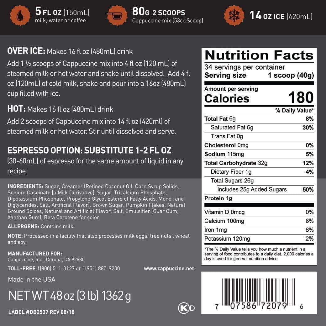The beloved autumn flavor Pumpkin Spice is now available from Cappuccine! This Cappuccine Frappe Mix is filled with the familiar flavor and smells of the beautiful autumn months. Whether you want to enjoy your drink hot or iced, the Cappuccine Pumpkin Spice is the perfect blend to have in your drink rotation! Cappuccine frappe mixes are made in the USA.
